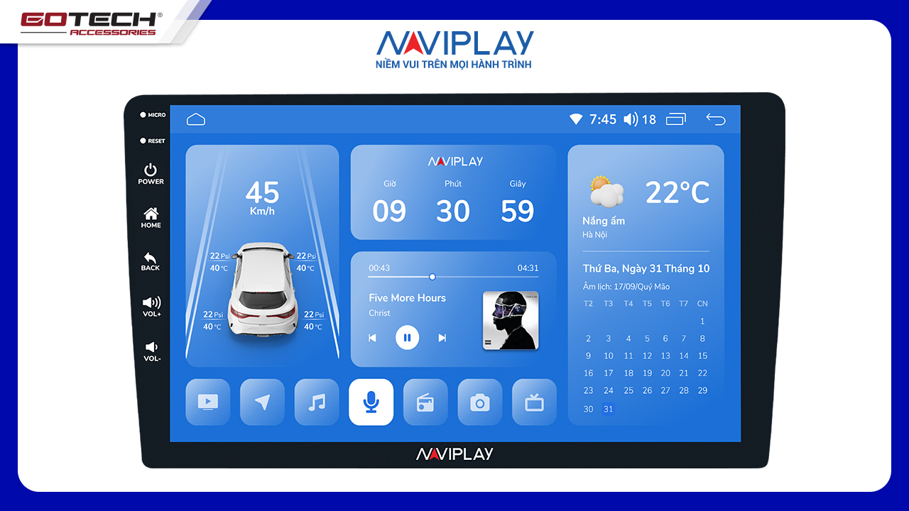 Giao diện màn hình ô tô thông minh NAVIPLAY NC6 được thiết kế theo tiêu chuẩn mới, bố cục sắp xếp khoa học mang đến sự thân thiện cho người sử dụng. Cùng với đó, màn hình Android ô tô cho phép người dùng tùy biến màu sắc theo phong thủy tạo nên điểm nhấn khác biệt cho khu vực Taplo. Màn hình NAVIPLAY NC6 sử dụng công nghệ chống chói IPS, độ phân giải 1280×720 mang đến trải nghiệm hình ảnh sắc nét, sống động đến từng chi tiết. Cung cấp sức mạnh cho màn hình ô tô thông minh là CPU 8 nhân, giúp quá trình xử lý tác vụ mượt mà vượt trội.