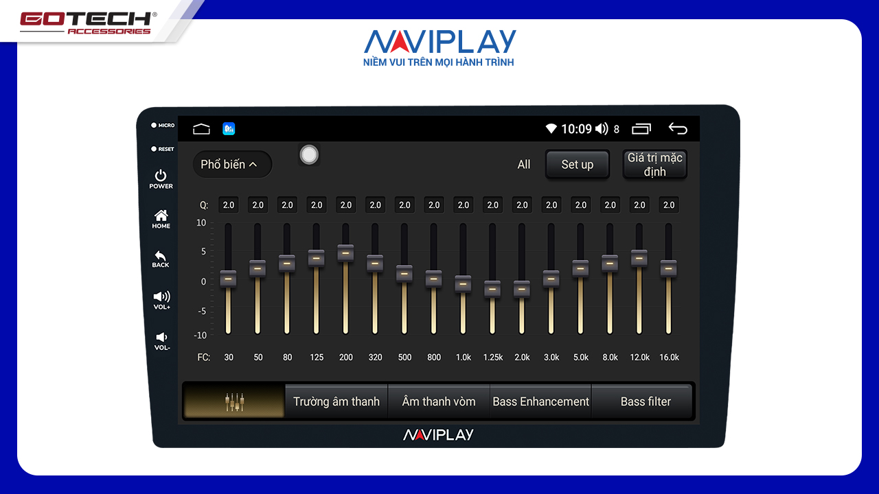 Trên màn hình ô tô thông minh NAVIPLAY NC6 được trang bị bộ xử âm thanh số DSP 32 kênh giúp cân bằng âm lượng của loa nguyên bản, nhờ đó âm thanh phát ra trong hơn, không lẫn tạp âm. Chưa hết, bạn có thể tùy ý hiệu chỉnh Equalizer trên màn hình theo thể loại nhạc để có được trải nghiệm nghe nhạc chất lượng như ở rạp.